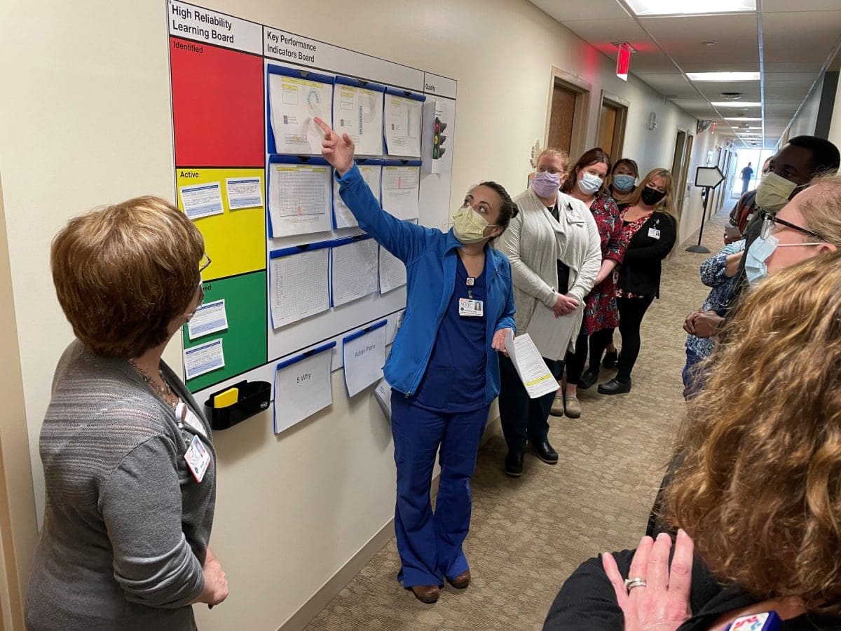 Along with the daily Gemba walks, the Learning Boards provide a system for reviewing safety topics on a monthly basis through Executive Patient Safety Rounds. Each month, senior leaders meet with staff at the Learning Boards to ensure progress is being made and help overcome any barriers.
